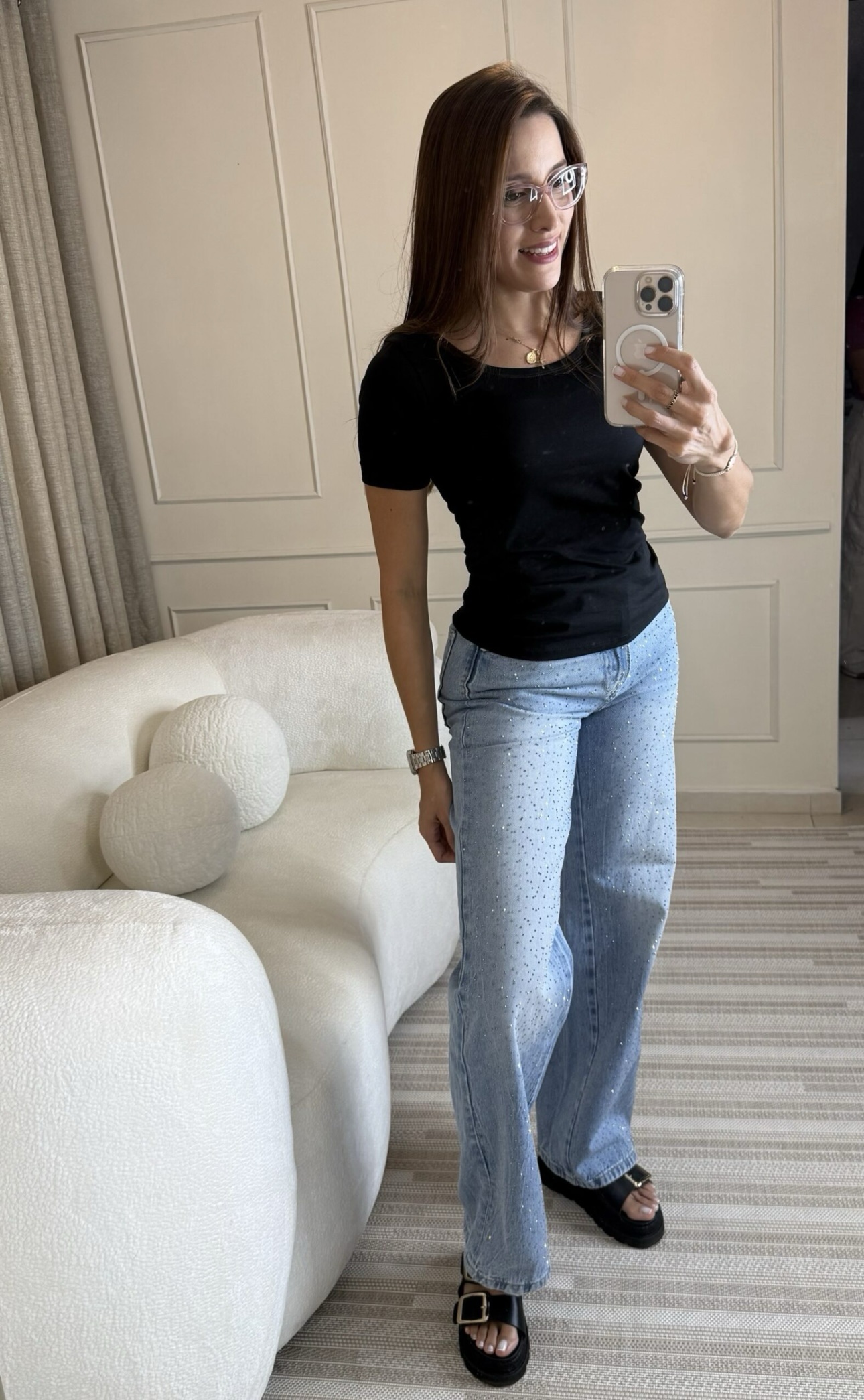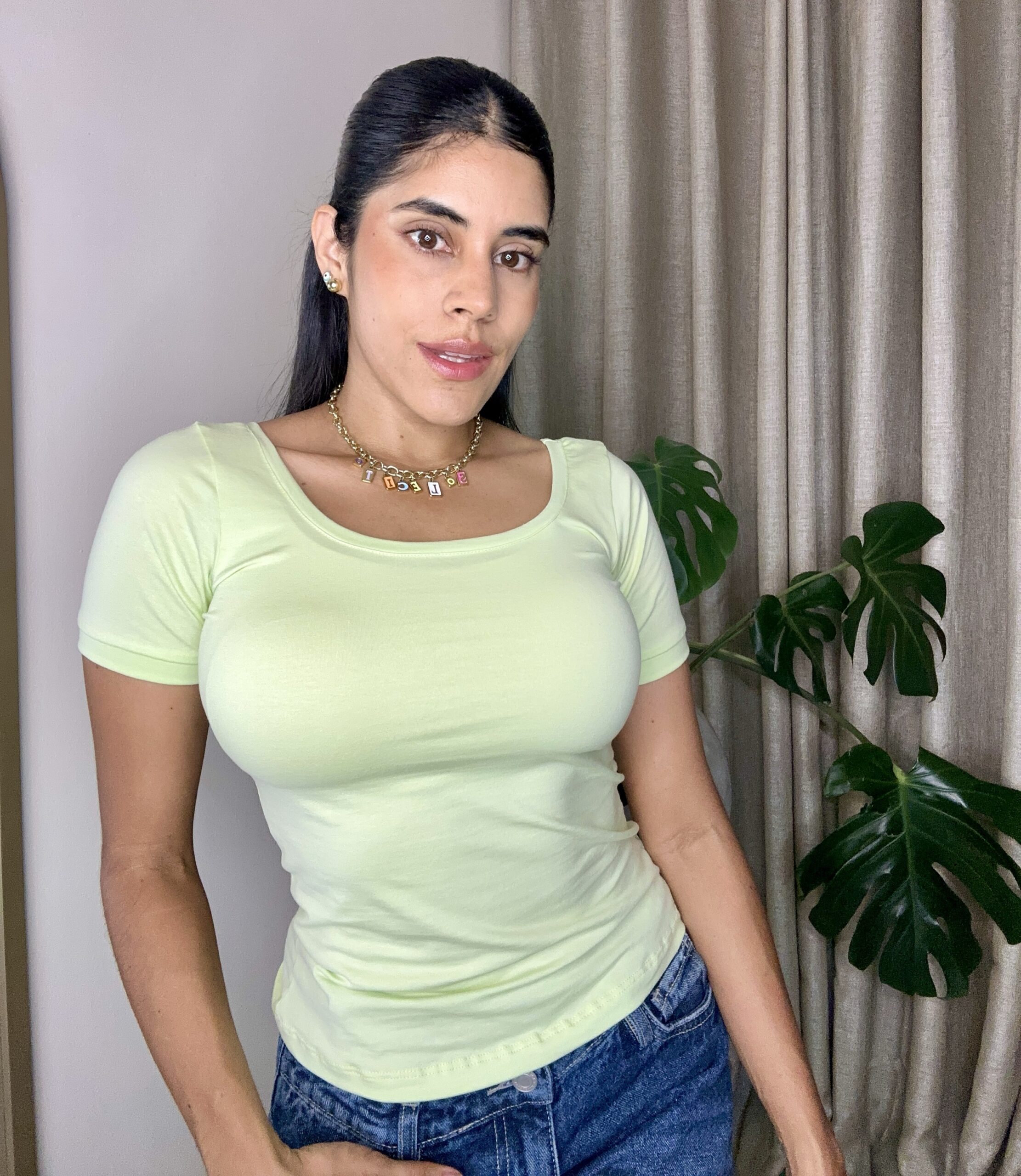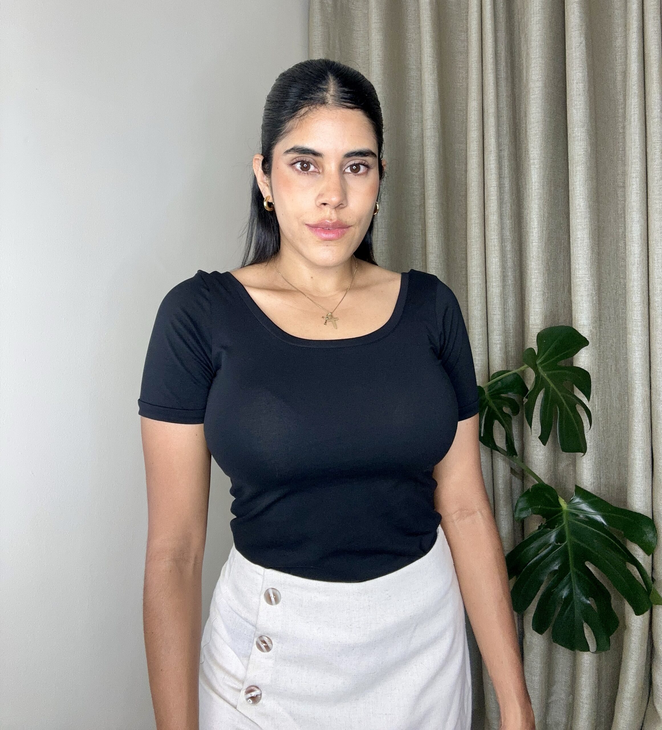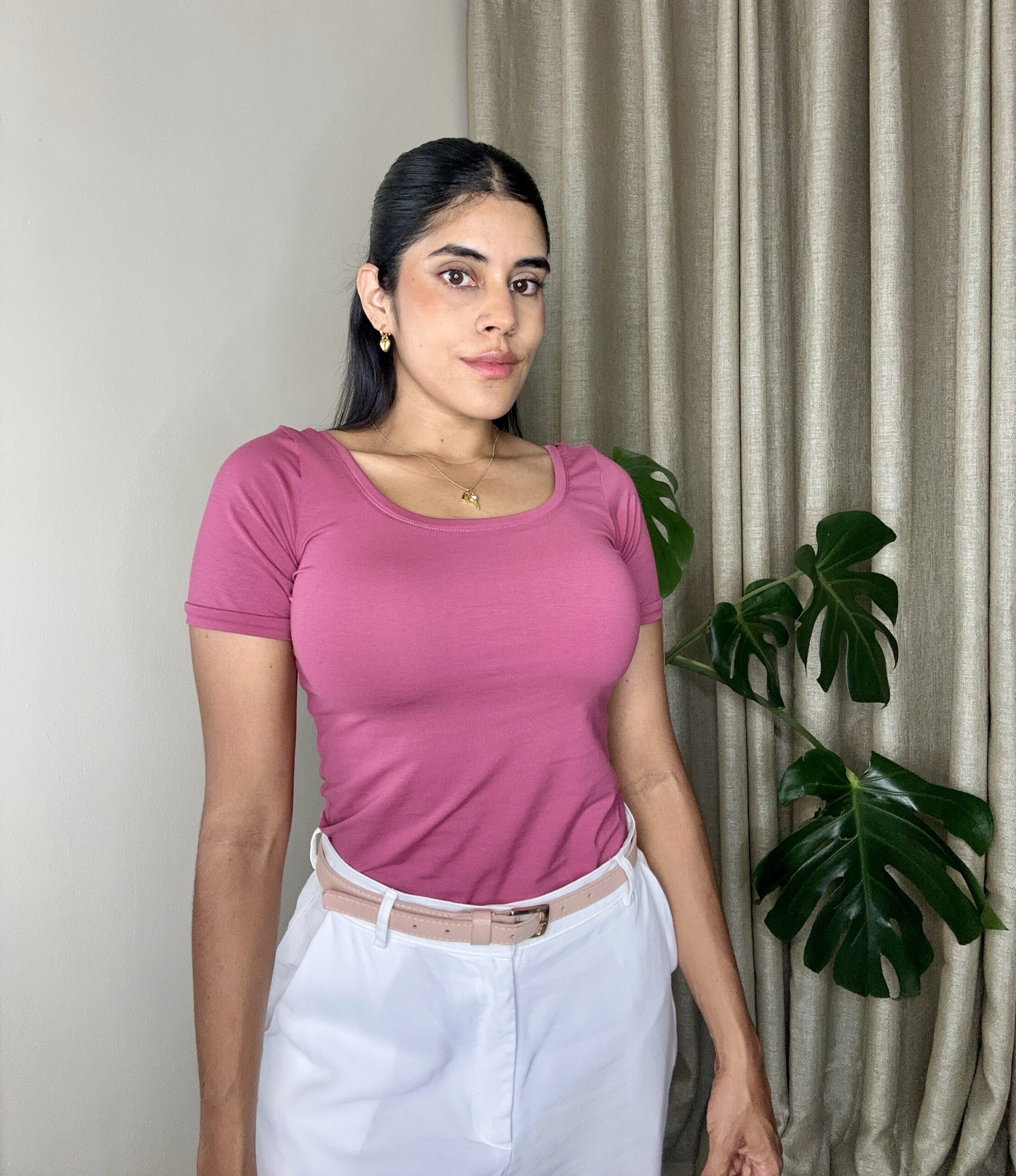 Blusa básica de manga corta diseñada en tela fría y suave que se ajusta cómodamente al cuerpo. Su corte limpio y minimalista la convierte en una prenda versátil y atemporal.