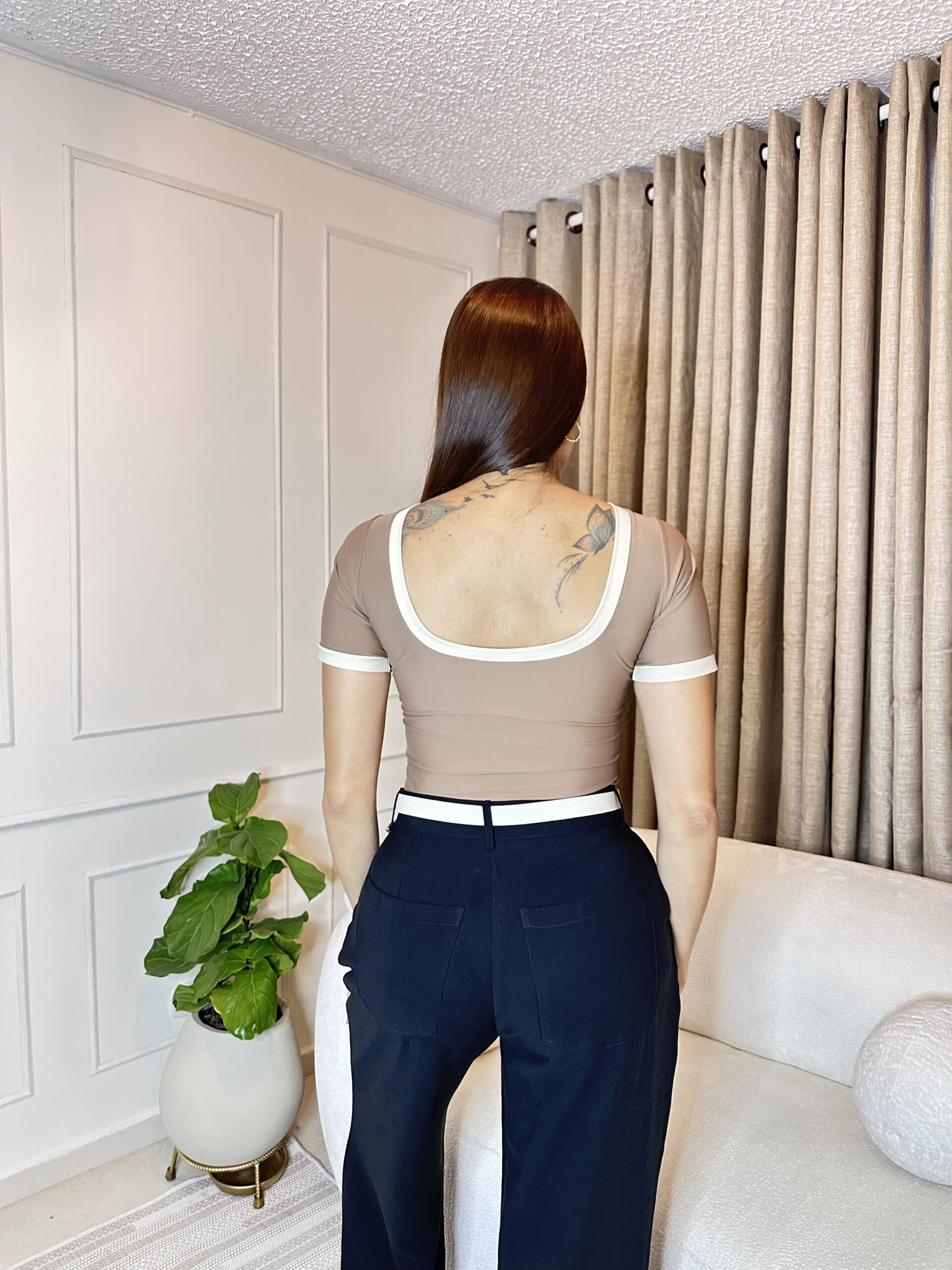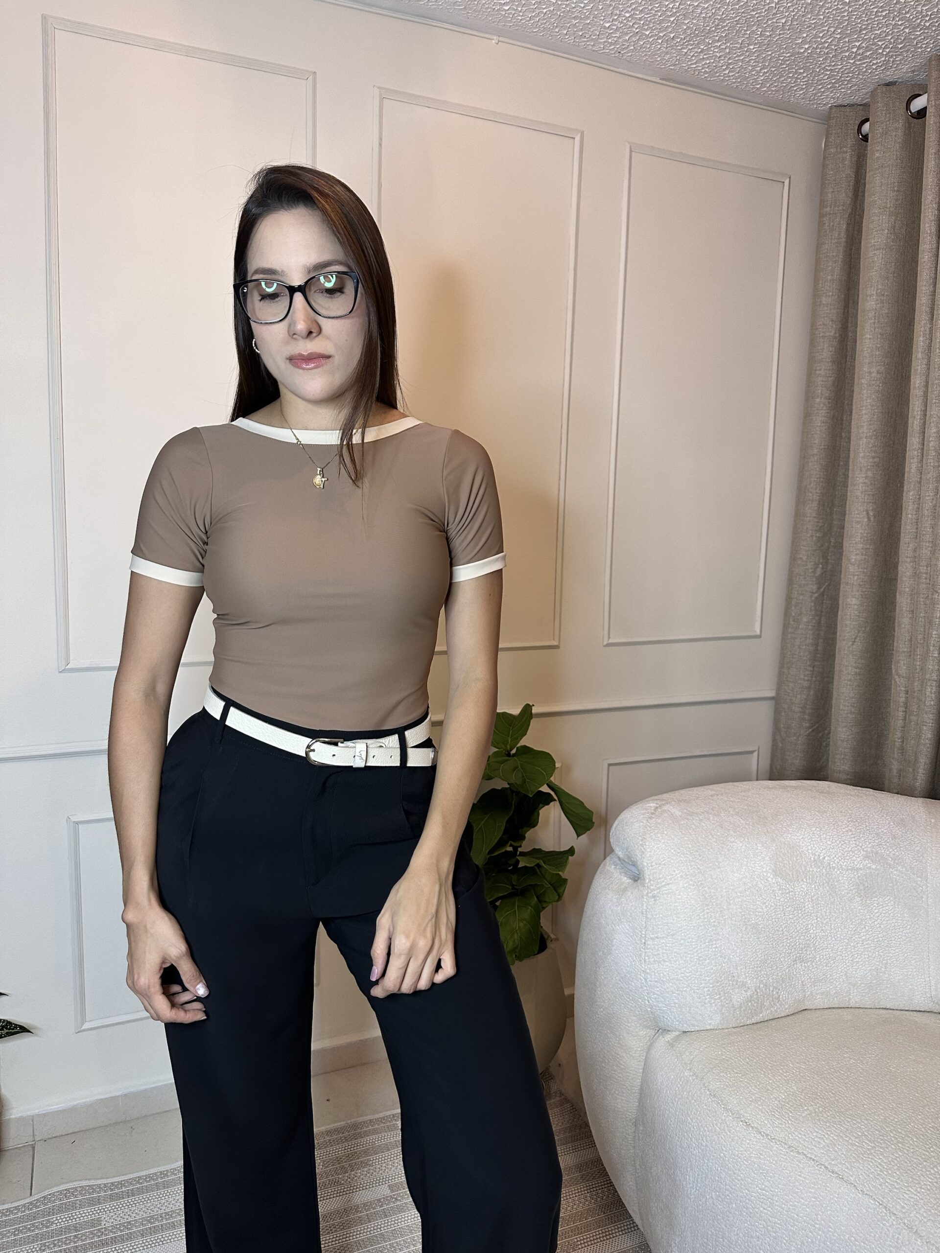 Body en doble tela en parte frontal, elástica, colores en contraste en manga y cuello, medio escote redondo en espalda.